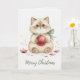 A sweet nostalgic Christmas card featuring an adorable fluffy kitten holding a shiny red ornament. Soft vintage tones, gentle textures and playful broken bauble pieces create a cosy and heart warming holiday moment. A charming way to send Merry Christmas wishes to anyone who loves cute festive illustrations with an old fashioned touch.