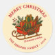 Vintage Christmas Sleigh with Gifts Classic Round Sticker. Celebrate the holidays in timeless style with this beautifully detailed vintage colored illustration of a Christmas sleigh brimming with gifts, holly, and pine sprigs. This cozy motif captures the nostalgic charm of Christmas. Add your family name and year.