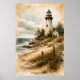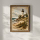 A vintage-style coastal scene featuring a weathered lighthouse overlooking a sandy shoreline and gentle ocean waves. Soft muted tones and rustic seaside details create a calm nautical atmosphere with timeless coastal charm.