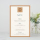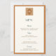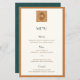 This vintage coastal wedding menu is designed for couples planning a beach or destination wedding with a modern vintage aesthetic. Featuring a refined art-deco influence and a balanced teal and warm orange color palette, it brings a polished yet relaxed feel to coastal wedding receptions. The subtle decorative detailing at the top adds a sense of structure and elegance, making the menu feel intentional and thoughtfully designed without overpowering the table setting.