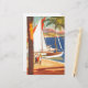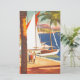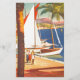 Besondere Vintage europäische Reisewerbung - Strand, Dorf, Menschen, Palmen, blaues Meer und Himmelsbild