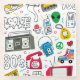 Vintage 80er Jahre doodle mit Auslegerbox, Fernseher, Kassette und anderem Objekt Ein Bersten Retro-Nostalgie mit Auslegerkästen, Kassetten und mehr. Trendy und lebendig! Retro-80er und Nostalgie-Doodles: Kassettenabspielgeräte, Boomboxen, und mehr! Doodle, 90er, 80er, Muster, Illustration, Retro, Vintag, Liebe, Boombox, Sport, Radio, Schuh, Telefon, Pop, Sketch, Musik, Clipart, Diskette, Papier, Dekor