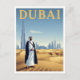 Experience the dazzling contrast of desert and metropolis with this striking vintage-style travel poster postcard for Dubai, UAE. The design captures a commanding view of the golden sand dunes where a caravan of camels treks, set against the futuristic skyline dominated by the magnificent Burj Khalifa. A figure in traditional Emirati attire (Kandura) stands proudly in the foreground, bridging the city's rich heritage with its modern ambition. The clear blue sky and warm desert tones create a luxurious, dramatic feel. This is a perfect postcard for fans of Middle Eastern travel, collectors of retro desert art, or those celebrating the innovation of the UAE.
