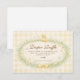 A charming vintage baby shower design featuring a sweet little duckling resting above a delicate floral wreath. Soft watercolor wildflowers and greenery frame the center, finished with a gentle ribbon bow and a warm yellow gingham background that adds a cozy nursery feel. The storybook illustration style and pastel countryside palette create a timeless, cottage-inspired look perfect for celebrating a new baby in a soft and elegant way.