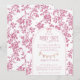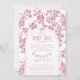 Feiern Sie Ihre Kleine in zeitloser Eleganz mit unseren Vintagen Dusty Pink Bow Floral Toile Baby Shower Einladungen. Inspiriert von der Viktorianischen französischen Toile de Jouy und mit feinen Coquette-Bögen, Blütenfloralen und einem süßen Teddybärendesign, ist diese Einladung ein Set für eine Babydusche. Mit sanften, rosa Farbtönen, eleganten Chinoiserie-Toilmustern und skurrilen Heißluftballonakzenten ist es eine Einladung, die Vintagen Charme mit moderner Eleganz verbindet.