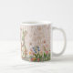 Charming coffee mug featuring vintage Easter bunnies quilted-style print design. Three adorable fabric-look rabbits with Easter egg basket and "Happy Easter" message wraps around mug. Cottage core shabby chic aesthetic. Perfect for Easter morning coffee, spring tea, or Easter gift. Nostalgic charm print.
