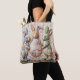 Tote bag featuring vintage Easter bunnies quilted-style print design. Three adorable fabric-look rabbits with Easter egg basket printed image. Cottage core shabby chic aesthetic perfect for Easter shopping, spring errands, farmers market, or everyday use. Nostalgic vintage charm print style.