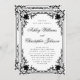 Diese elegante Schwarz-Weiß-Hochzeitseinladung mit Vintager Luft hat einen verzierten Rahmen mit eleganten barocken Dekorationen auf weißem Hintergrund. Die Namen der Braut und des Bräutigams sind in einer eleganten kalligrafischen Schrift geschrieben. Alle Texte sind schwarz, wie der Vintage Rahmen, und können personalisiert sein. Der Vintage, verzierte Rahmen basiert auf einer antiken französischen Buchbinderei von Georges Mercier (1885-1939) - Madame de Maupin von Theophile Gautier, Ausgabe 1911, jetzt öffentlich zugänglich.
