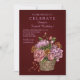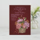Ein feminines Blumendesign mit rosa und rostfarbenen Blume und Beeren, die in einem Korb aus Korbweide mit tiefbordeauxfarbenem Hintergrund angeordnet sind.
