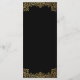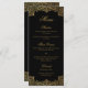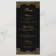 Dieses elegante Hochzeitsmenü mit Vintagem Ambiente ist beiderseits goldfarben, an den oberen und unteren Rändern auf schwarzem Hintergrund gehalten. Der Titel "Menü" und die Untertitel werden in einem kalligrafischen Skript geschrieben. Alle Texte können personalisiert sein und haben eine goldene Farbe, die den goldenen Rahmen ähnelt. Die elegante Golddekoration stammt aus einem Vintagen französischen Buchcover, der aus dem späten 19. Jahrhundert stammt und heute im öffentlichen Besitz von Nicolas Denis Derome (1731-1790), bekannt als Derome le Jeune, für ein Buch mit dem Titel "Gaspar Pergam Epistol" steht.