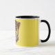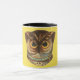 Das Gesicht einer scheinbar verärgerten Eule in braun, gelb, schwarz und blau. Aus einem Vintagen Senfetikett abgeleitet.