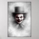 • A scary retro clown model poses in formal attire for a studio portrait.