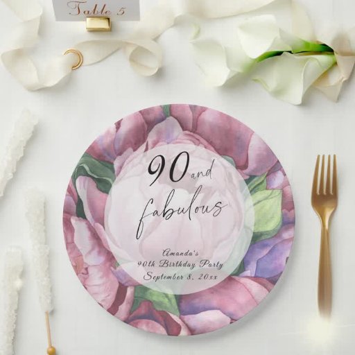Vintage florale 90. Geburtstagsfeier mit "90 & Fabulous" in einem stilvollen Drehbuch und Aquarellbühnen (Peony Rose).