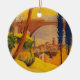 Retro European Travel Advertising - Gelb, grüne Frühlingsfarbe Bahnreise und Zug, Steinbrücke und Illustration des historischen Dorfes
