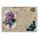 Eine Antike, Hand geschriebene französische Postkarte macht einen wunderbaren Hintergrund für den Blumenstrauß der Blumen und des blauen Schmetterlinges in der Ecke.