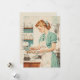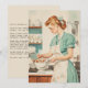 Eine Retroillustrierung einer Frau in einem aquamarinen Kleid und einer blumigen Schürze, die Ostereier in einer gemütlichen Küche zubereitet. Die Szene strahlt eine nostalgische Ästhetik aus den 50er Jahren mit Pastelltönen und detaillierten Küchenartikeln aus.