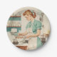 Eine Retroillustrierung einer Frau in einem aquamarinen Kleid und einer blumigen Schürze, die Ostereier in einer gemütlichen Küche zubereitet. Die Szene strahlt eine nostalgische Ästhetik aus den 50er Jahren mit Pastelltönen und detaillierten Küchenartikeln aus.