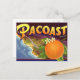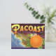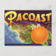 Vintage Illustration Fruchtkiste mit einer großen, reifen, Bio Orange mit Blume und einer Karte der Südküste des Staat von Kalifornien mit dem blauen Pazifik. Retro Werbung für Pacoast-Orangen, frische Zitrusfrüchte aus dem Bauernhof. Gesunde Ernährung mit Vitamin C.