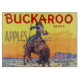 Vintage Illustration Obstkiste Kunstwerbung mit einem Cowboy, der in der Wüste ein buckliges Broncopferd reitet. Der goldene Hintergrundhimmel könnte entweder ein Sonnenaufgang oder ein Sonnenuntergang über der Prärienlandschaft sein. Eine Retro-Werbung für Äpfel der Marke Buckaroo.