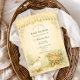Ein charmantes, märchenhaftes Babyshower-Design mit einer süßen, aquarellierten Gans, die neben einem Nest mit pastellfarbenen Eiern steht. Zarte Frühlingsblumen und sanftes Grün schaffen eine idyllische ländliche Szene, während eine rosafarbene Schleife und ein Hintergrund mit Salbei-Gingham-Muster einen gemütlichen Cottagecore-Touch hinzufügen. Der vintage-illustrative Stil und die weiche Pastellpalette verleihen diesem Design eine verspielte, kindliche Atmosphäre, perfekt für eine fröhliche und herzliche Babyparty.