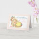 Ein niedliches Baby, das sich in einer von Blume umgebenen Kinderkrippe und einem niedlichen kleinen Hasen befindet. Vintage-Bild vollständig restauriert liebevoll passend mit einem süßen hellrosa und weißen Polka-Punkte-Muster im Hintergrund. Geschrieben "Glückwunsch" in blau, extravaganten Schriftart.