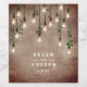 Vintage Edison-Lichter mit botanischer Vegetation, die von oben über verwittertem Backstein hängt. Vintag inspiriert Text mit Namen von Braut und Bräutigam und Hochzeitstag.