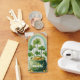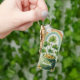 Ein Schlüsselanhänger mit einem saisonalen St. Patrick's Day-Motiv. Vergilbtes Grunge-Papier. Ein grüner Goldtopf, aus dem Münzen herausquellen. Ein farbenfroher Regenbogen darüber und überall herumwachsender Klee.