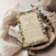 This timeless botanical design combines soft green foliage and ornate vintage scrollwork on a parchment-style background. The elegant greenery frame adds a refined yet natural feel, perfect for garden weddings, classic ceremonies, or nature-inspired events. Fully customizable for your special day.