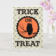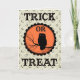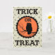Vintage Halloween-Karte aus der Viktorianischen Zeit mit Text, der "Trick or Treat" mit und Eule auf einem Zweig im Zentrum eines großen orangefarbenen Mondes sagt.