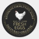 "FRISCHE EIER", bedruckt in einem 3D-geprägten metallischen Schriftart und einer Vintagen Hühnerabbildungen mit extravagant gepunktetem Rand, macht dies zu einem klassischen altmodischen Etikett für Ihre Eierschachteln oder Hühnerhauskorrespondenz. Ihr Firmenname und Ihr Standort sind in einer malerischen englischen Schrift aus dem 17. Jahrhundert geschrieben.