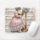 Eine junge Frau in einem rosa, spitzengetrimmten Kleid spielt eine Harfe, umgeben von Noten