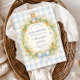 Ein charmantes, vintage Baby-Shower-Design mit einem süßen Wasserfarben-Hasen, der über einem zarten Frühlingsgarten-Kranz ruht. Weiche Gänseblümchen, Grün und kleine Karotten bilden einen fantastischen botanischen Rahmen, vervollständigt durch eine sanfte Schleife und einen weichen blau karierten Hintergrund. Der Stil der Illustrationsgeschichte und die pastellfarbene Landpalette schaffen eine zeitlose Cottagecore-Ästhetik, die warm, verspielt und perfekt ist, um die Ankunft eines neuen kleinen Erdenbürgers zu feiern.