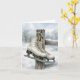 A pair of white ice skates hangs from a rustic wooden post, surrounded by softly falling snow in a serene winter landscape of snow-covered trees, illustrated in watercolor