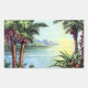 A public domain vintage art of an island with palm trees, flowers, ocean and sunrise or sunset from a children's bible storybook.