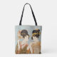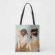 Schöne Tote-Taschen im Überdruck! Erhältlich in zwei Stilen und zwei Größen! Vintages Bild des täglichen Lebens mit zwei wunderschönen Frauen, traditionelle japanische Entertainerinnen genannt Geisha Girls (geiko oder geigi), deren Aufgabe hauptsächlich darin besteht, männliche Kunden zu unterhalten. Sie fungieren als Hostessen und ihre Fähigkeiten umfassen darstellende verschiedene japanische Künste wie klassische Musik, Tanz, Spiele und Konversation. Eine Dame hält einen Ventilator, die andere bindet eine Kette um ihr Handgelenk. Sie liegen beide vor einem aquamarinen und bunten Hintergrund.