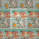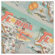 Dieses Muster aus einer Vintagen Postkarte von Florida zeigt die touristischen Attraktionen des Staat, zusammen mit farbenfrohen Illustrationen von Orangen, einem Alligator, einer Palme und einer Badebeauty. Kitsch aus der Geschichte Floridas.