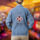 Denim Jacke mit Herz, Pik, Diamanten und Kleber der berühmten Farben der Spielkarten in einem Vintagen Stil und anpassbaren Text. Perfektes Geschenk für ein Mädchen, das ein Liebhaber von Kartenspielen ist!