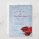 Elegantes, Vintag kaskadenblaues Hochzeitsdesign mit dekorativen Eckrollen oben und unten mit einem Foto von drei rote Rosen in der unteren Ecke. Der Hintergrund erhält eine strukturierte Grunge-Anwendung für ein antikes Papierlook. Dieses Design kommt in mehreren fertigen Hintergründen. Dieses Design kommt auch auf viele andere Schreibwaren Produkte, um Anzug alle Ihre Hochzeit Set benötigt.