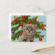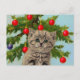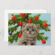 Postkarte mit einer Vintagen Katze und einem Weihnachtsbaum! Ein flauschiges graues Kätzchen sitzt hübsch vor einem grünen Weihnachtsbaum. Der Baum ist in Rot und Blau dekoriert. Ein gemütliches Geschenk für die Weihnachtszeit und Katzenliebhaber!