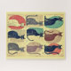 Puzzle in neun stilisierten Katzen, die in einem Gittermuster angeordnet sind, jedes Set gegen verschiedene farbige Hintertropfen. Die Katzen sind in verschiedenen Farben und Mustern gehalten und verleihen jedem ein einzigartiges Aussehen.