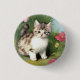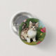 Schaltfläche mit einer Vintagen Kätzchen-Abbildung. Eine flauschig weiße Katze mit dunklen Streifen spielt in einem Grasstreifen mit roten Blume. Ein niedliches Geschenk für Katzenliebhaber und Viktorianische Kunstsammler.