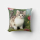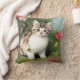 Kissen mit einer Vintagen Kätzchenillustrierung. Eine flauschig weiße Katze mit dunklen Streifen spielt in einem Grasstreifen mit roten Blume. Ein niedliches Geschenk für Katzenliebhaber und Viktorianische Kunstsammler.