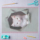 Three different vintage images of cute kittens ripping through giftwrap paper. Adorable images for gifts or crafts.this one is a white kitten on a faded teal gray and pink background