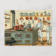 Große Vintage Darstellung der Köche in der Küche. Der Koch ist am Ofen, während der unter Koch seine Kochtechniken beobachtet. Ein anderer Koch bereitet den Nachtisch zu. Wunderbarer Blick auf eine Vintage Küche.