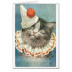 Vintage Grafik durch Arthur Thiele kennzeichnet ein Porträt einer Katze, die einen Clownhut und einen gekräuselten Kragen mit einem komischen Blick auf dem Gesicht der Katze trägt. Der deutsche Künstler, Karl Robert Arthur Thiele (1860-1936) ging allgemein durch den Namensarthur Thiele. Er war ein Illustrator der Bücher, der Noten und der Postkarten. Er war für seine komischen anthropomorphen Tiere berühmt, die in der Kleidung gekleidet wurden und in den menschlich ähnlichen Szenen dargestellt waren. Dackeln waren ein Lieblingsthema von seinem. Zusätzlich zu den Tieren andere Themen war er illustriert Sportpostkarten, das Gemüse, das zum Leben, Snowmen geholt wurde und badete Schönheiten und Propagandapostkarten der Ära WW1. Das Internet ist von den Hinweisen voll, die Karl Robert Arthur Thiele mit einem anderen deutschen Maler seiner Zeit verwechseln, die Julius Arthur Thiele genannt wird, der Landschaften malte. Sie sind nicht der gleiche Künstler. Diese Karte ist leeres Innere für Ihre eigene Mitteilung.