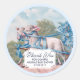 Eine Babydusche bedankt sich beim Aufkleber mit einem Vintage-Bild von 2 sanften Lämmern, die einen Wagen ziehen (unsichtbar) und mit hübschen blauen Bändern dekoriert sind.