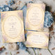 Ein romantisches, vintage Hochzeitsdesign, inspiriert von klassischer europäischer Gartenschreibwaren. Zarte, lavendelfarbene Wassercolor-Blüten umrahmen ein elegantes, geschwungenes Etikett, das vor einem warmen Pergament-Hintergrund mit zarten botanischen Akzenten platziert ist. Die verfeinerte Typografie und die antik inspirierte Umrandung schaffen eine zeitlose, ererbte Ästhetik, die an Hochzeiten auf dem Lande in der Provence erinnert, perfekt für Paare, die elegante botanische Details und charmant-vintage Atmosphäre lieben.