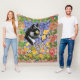 Eine wunderschöne Decke für Katzen und Katzen, die mit dem wunderschönen, whimsical Werk des berühmten englischen Katzenkünstlers Louis Wain zu tun hat. Die schwarz-weiße Katze mit großen gelben Augen riecht nach den Blume, den gelb-orangefarbenen Nestern, und im Hintergrund graben winzige blaue Blumen wie Sterne im lila dunkelblauen Himmel. Ich habe einen Hintergrund exotischer Hibiskus-Blume und Blätter in Orange-, Gelb- und Grüntönen hinzugefügt. Ursprünglich als Cat in einem Meer von Blume bezeichnet, habe ich der Vintagen Abbildung einen Flügelrand gegeben. Die Decke würde ein schönes neues Zuhause, neues Haustier oder Hauswärmeschenk für jeden machen, der Katzen .