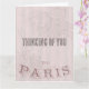 Dieses einzigartige Design zeichnet sich durch eine fett gedruckte Schrift des Wortes "Paris" aus, mit Hintergrundskizzen von Blume auf einem hellrosa, blassfarbenen Hintergrund der Rose.