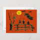 Eine hübsche, Vintage Illustration einer Hexe, die einen Zauberstab hält und ihren Besenstiel reitet. Die Hexe trägt einen Hut, ein Kleid und einen Mantel, und sie sieht aus, als wäre sie eine ältere Frau. In der Vintagen Abbildung, sind auch drei singende Katzen, sitzen auf einem Holzzaun. Es gibt auch zwei Fledermäuse, einen lächelnden Mond, einen alten Baum und eine Eule. Ideal für diejenigen, die Halloween Liebe, spuke Themen, Hexen, schwarze Katzen, Monde, Eulen oder alles Vintage.